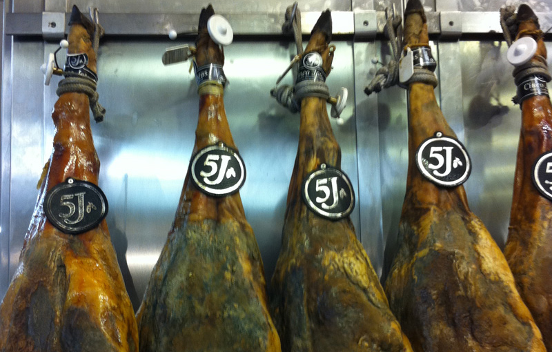 – Juan Pedro Domecq, Un jambon Pata Negra de race ibérique, de cochons élevés en liberté et nourris aux glands à la Sierra de Huelva. Ces jambons sont affinés un minimum de trois ans dans a Jabugo. (Pièce entière: 54 euros / kilo).